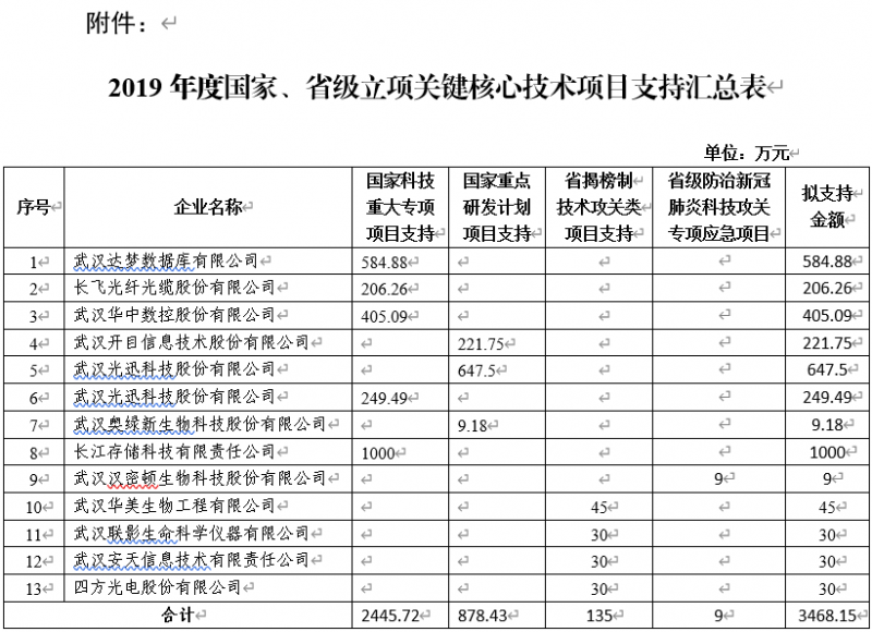 按照《關(guān)于申報(bào)東湖高新區(qū)2019年度國家、省級(jí)立項(xiàng)關(guān)鍵核心技術(shù)項(xiàng)目支持的通知》要求以及管委會(huì)相關(guān)規(guī)定,經(jīng)企業(yè)申報(bào)、審核、實(shí)地考察等流程,現(xiàn)將支持結(jié)果予以公示,公示期為2020年6月9日-6月15日。如有異議,請(qǐng)于6月15日下午17:00前將書面意見(蓋公司/單位公章)反饋至管委會(huì)科創(chuàng)局,逾期不予受理。