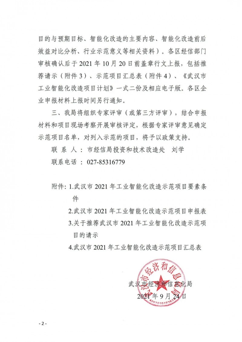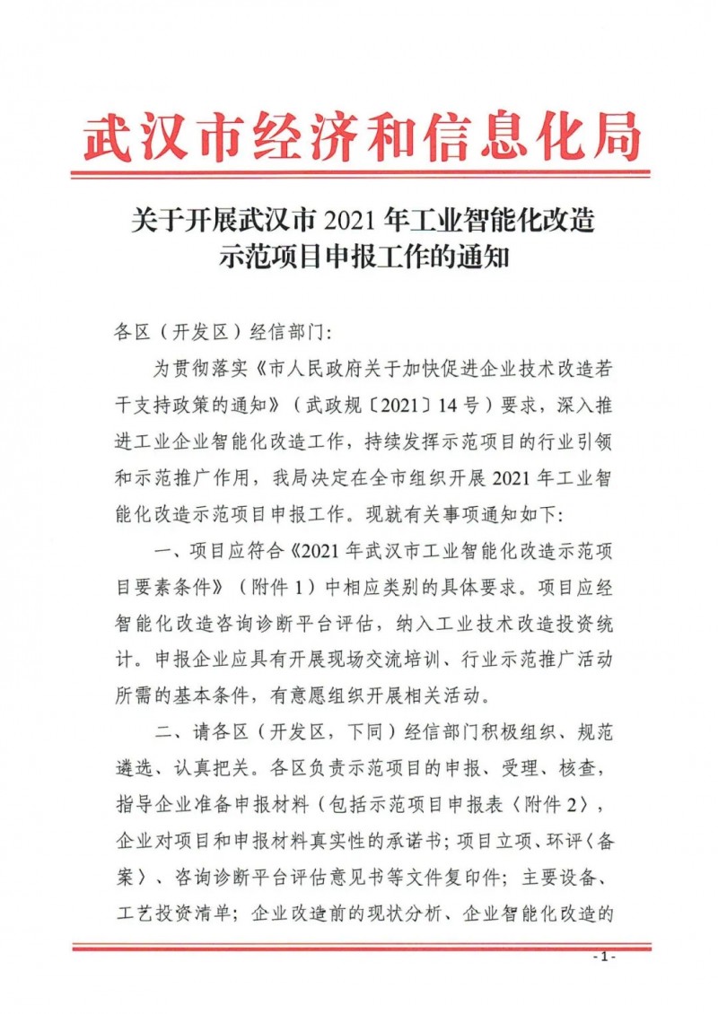 關(guān)于開展武漢市2021年工業(yè)智能化改造示范項目申報工作的通知